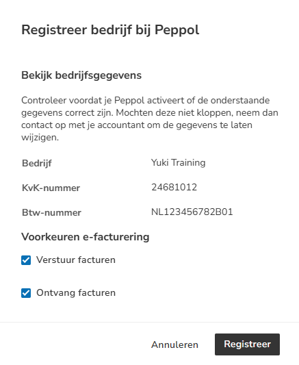 To use the Peppol network for receiving and/or sending e-invoices, you must register your company (read administration in Yuki) via a so-called Access Point.