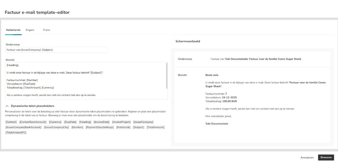 Here you can define for a sales invoice, credit note and/or reminder the default subject and message of the Dutch, English or French e-mail containing the invoice.