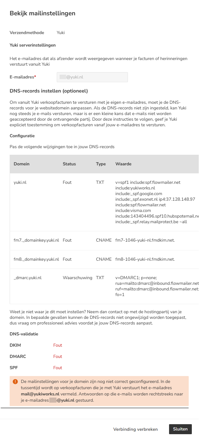 In order to send sales invoices from Yuki using your own email address, the DNS records must be changed.