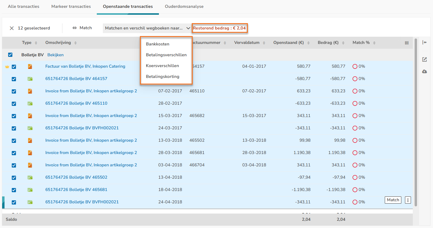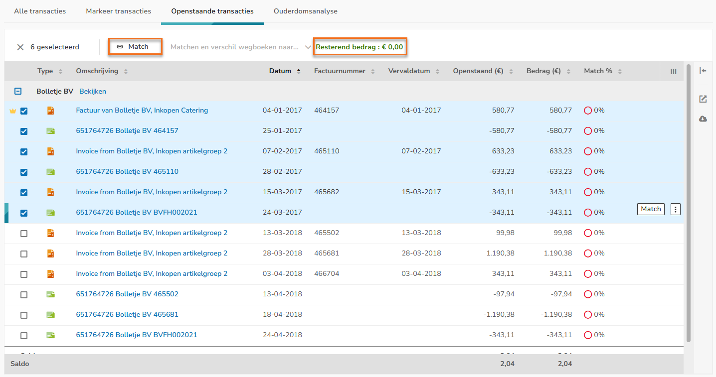 To match a customer's outstanding items all at once, select the relevant outstanding items and then click on Match at the top of the screen.