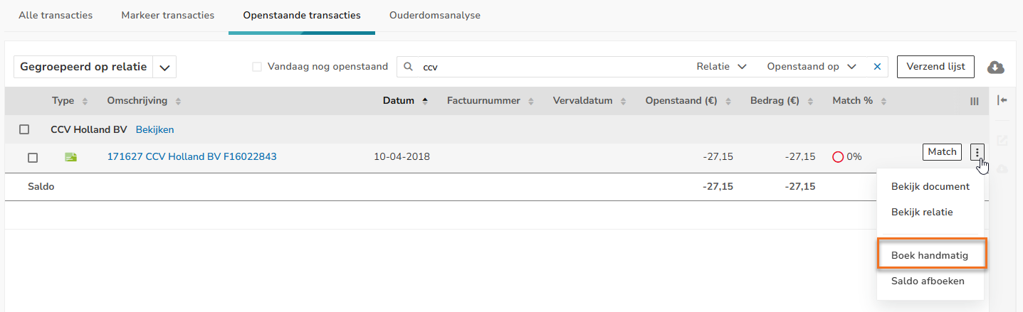 To manually post a bank transaction to a GL account (without VAT), hover your mouse over the line of the relevant bank transaction, click on the button with the three dots, and then select the Book manually menu option from the dropdown menu.