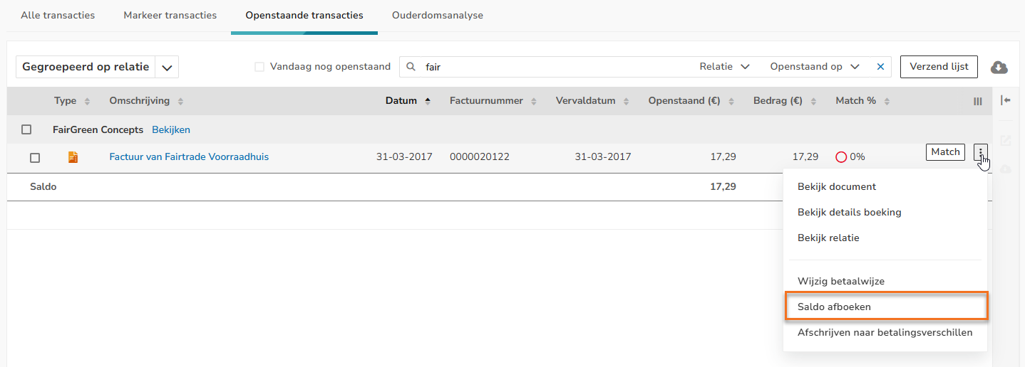 To write off the remaining balance of an outstanding invoice or bank transaction, hover your mouse over the line of the relevant invoice or transaction, click on the button with the three dots, and then select the Write-off balance menu option in the dropdown menu.