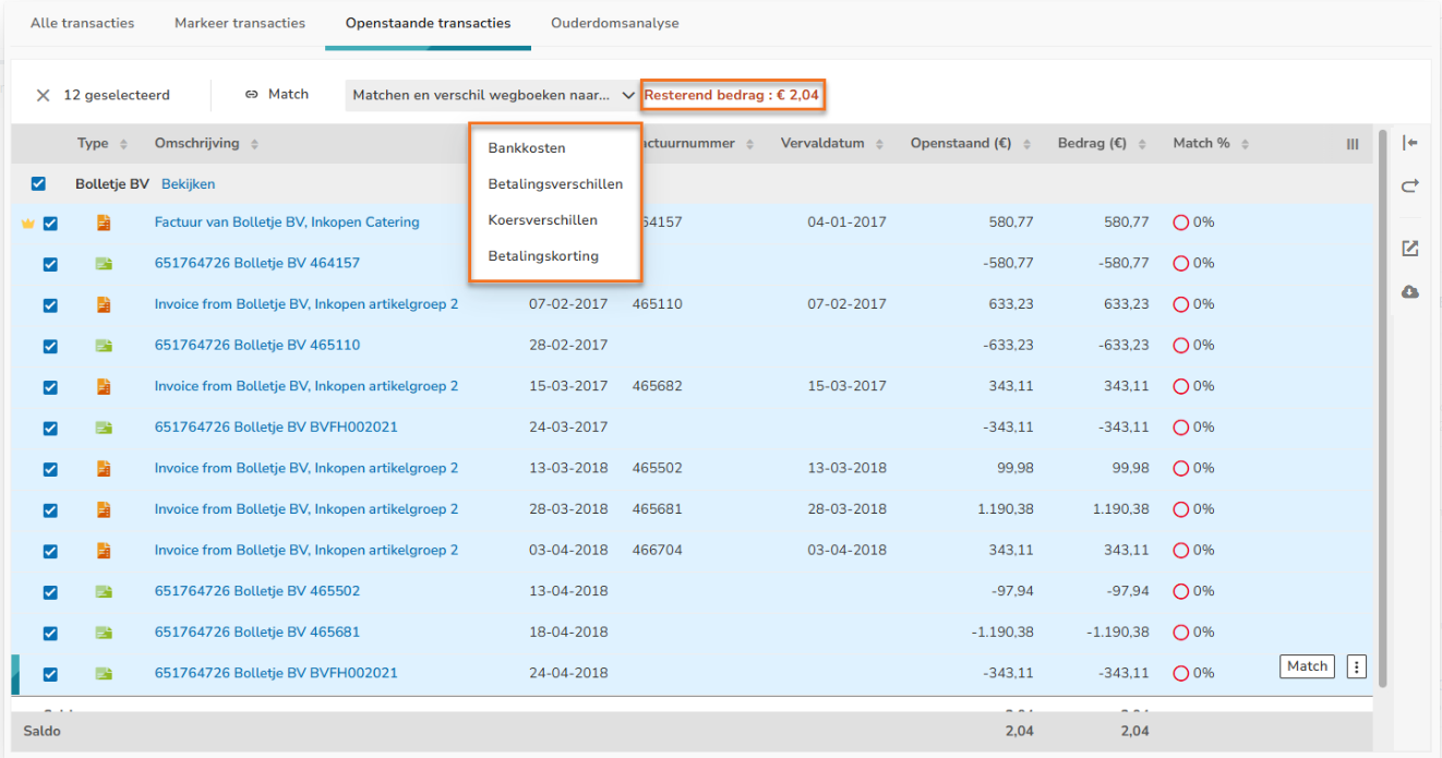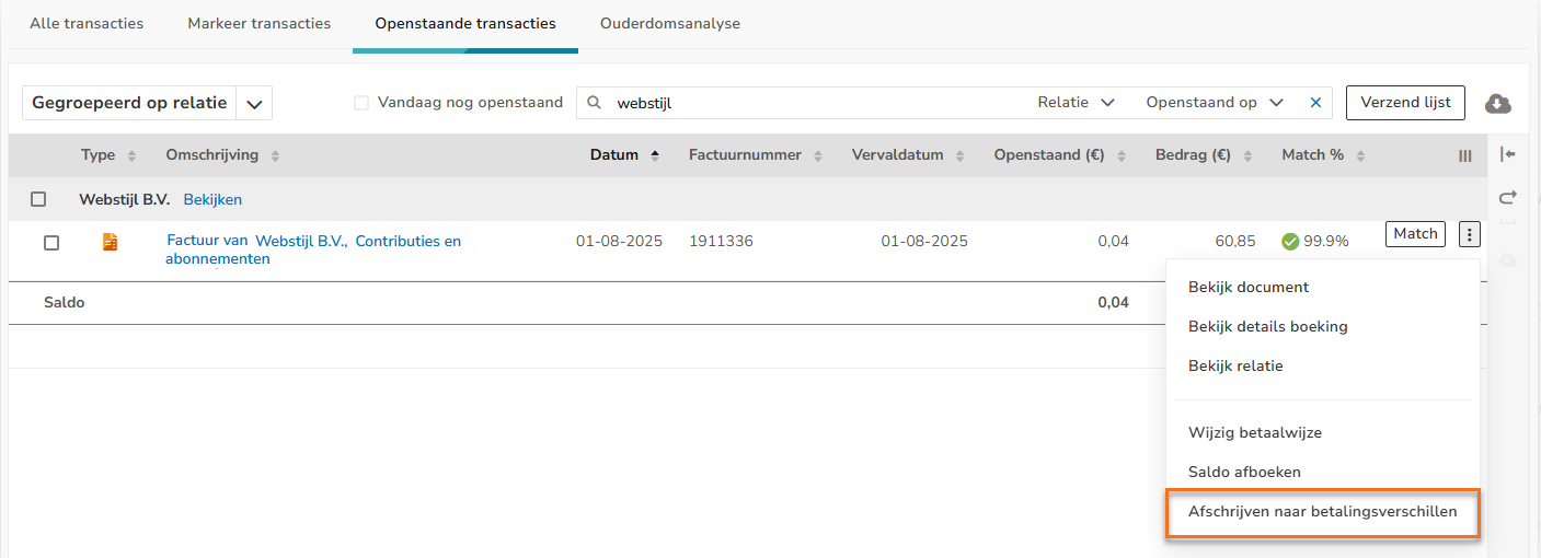 - write off outstanding item (invoice) of the contact to payment differences.