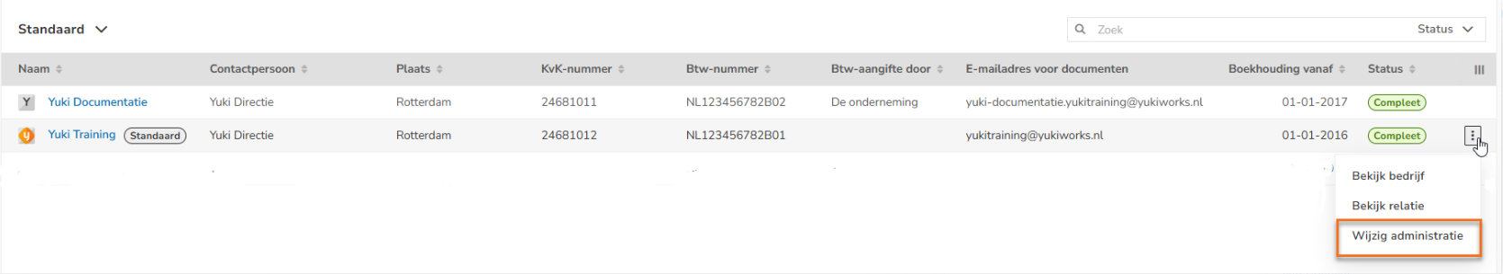 To change the address in the administration profile of the company, hover your mouse over the line of the relevant company. Then click on the button with the three dots and select the Edit administration menu option in the dropdown menu.