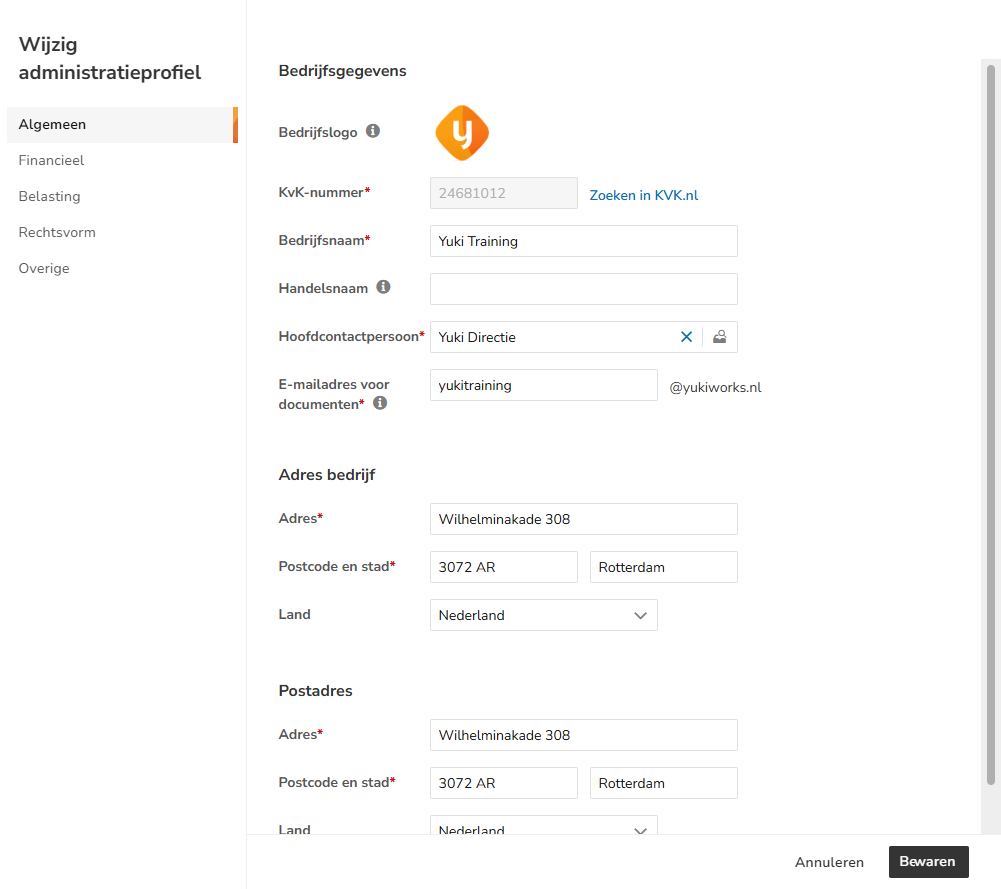 The address of your company (administration) and, if applicable, mailing address in Yuki are located in the so-called administration profile.