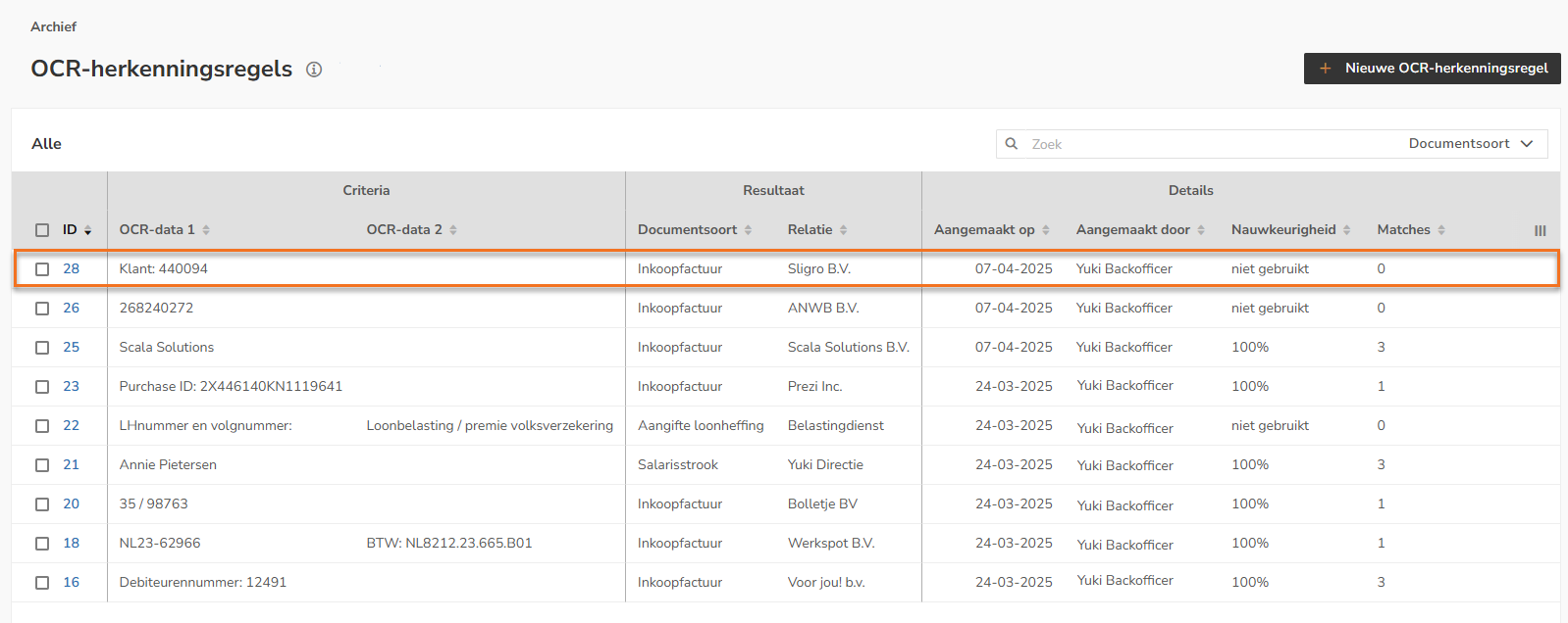 To further improve the automatic document processing rate (based on IDR and if activated Maximum Recognition) in Yuki, document match rules can be created in a domain based on OCR data found in a document. OCR stands for Optical Character Recognition or in Dutch, optical character recognition (reading text from an image).