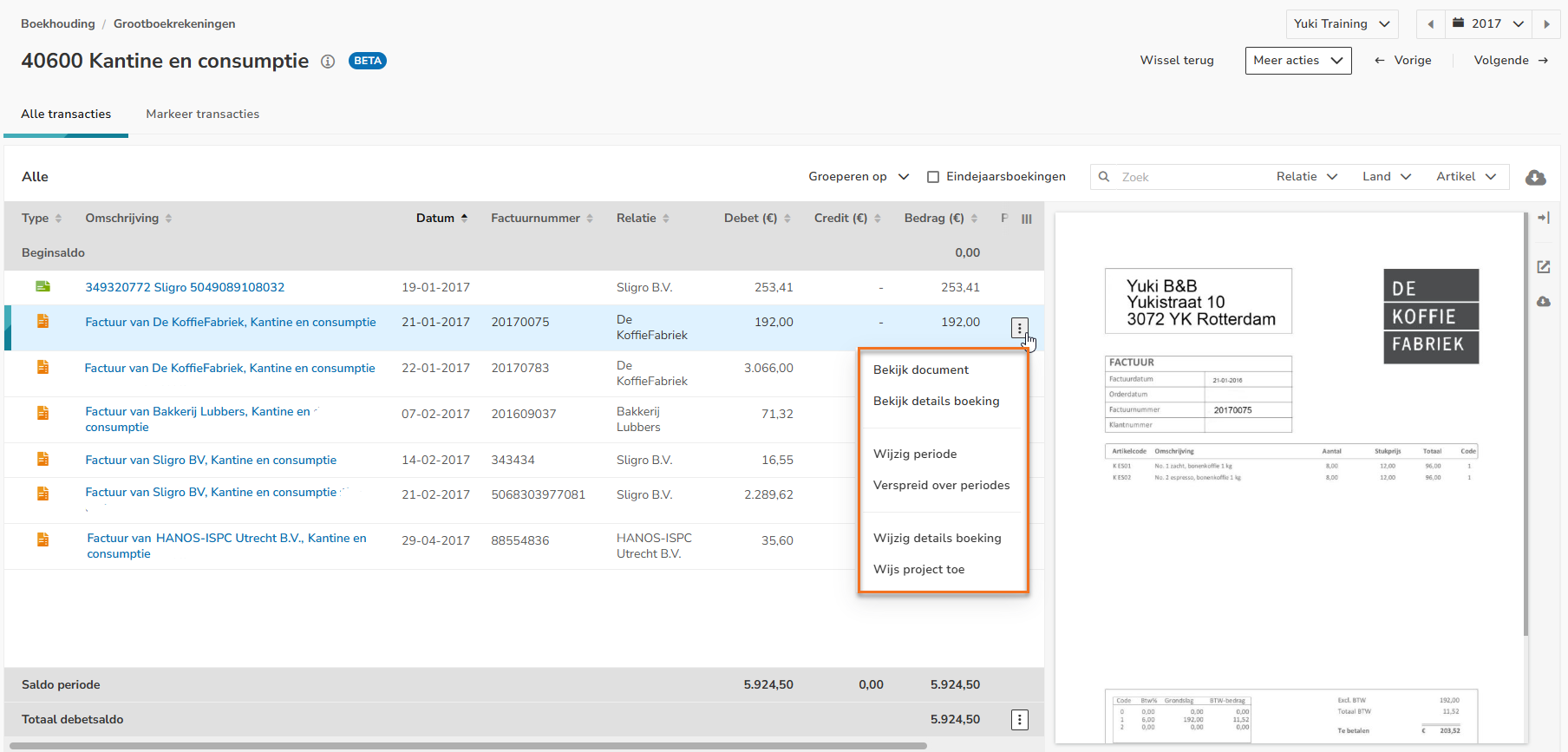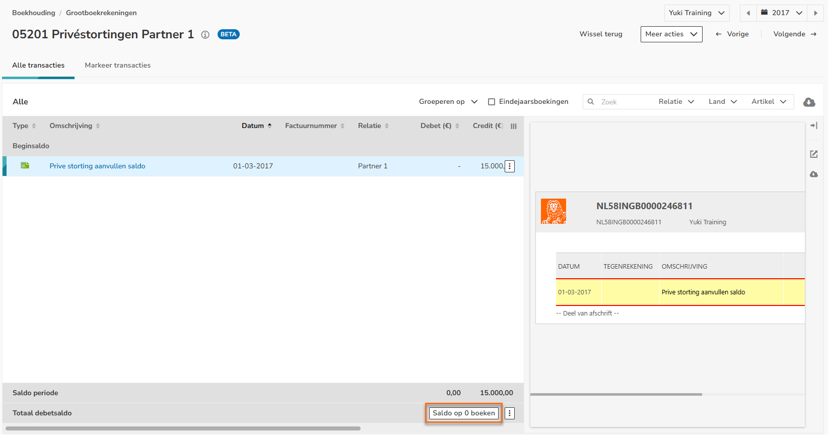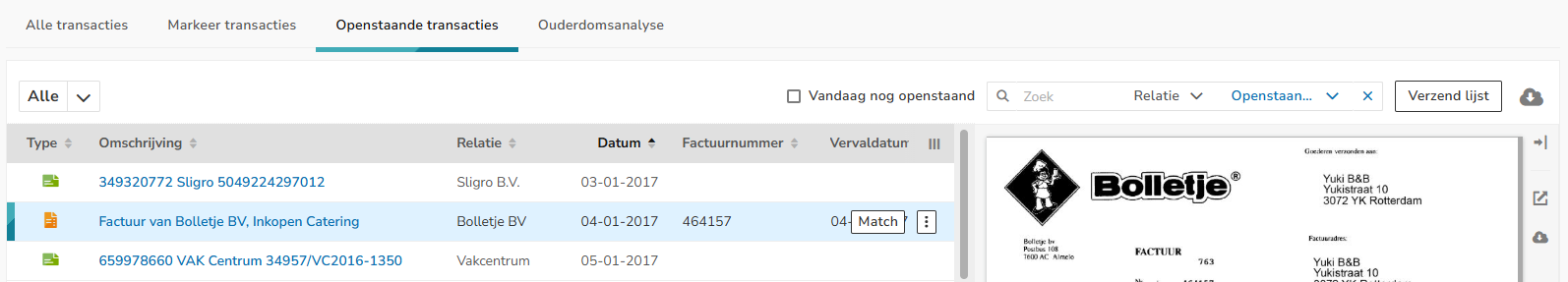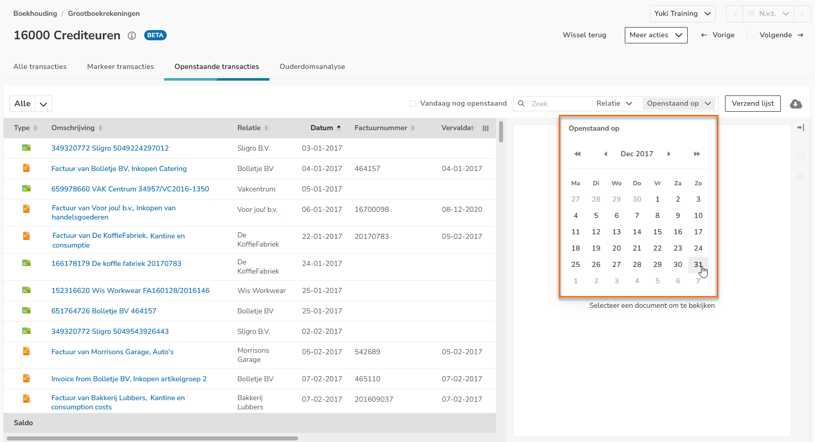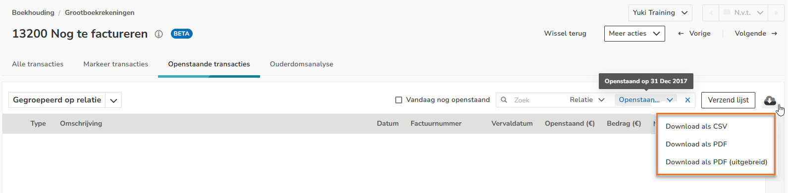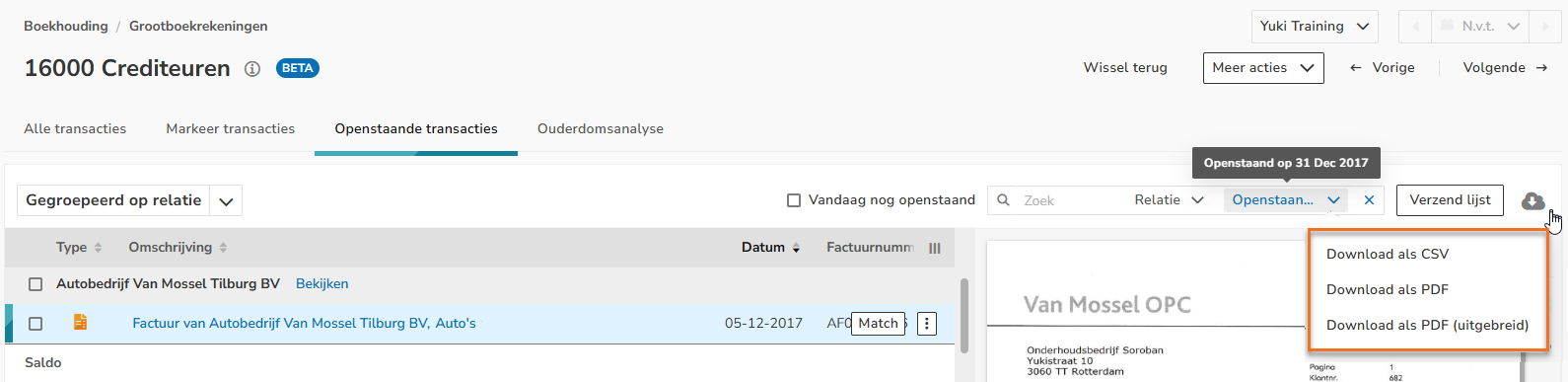 Click on Outstanding transactions at the top of the screen. Then, on the right side of the screen, select the date 31-12-2017 behind Outstanding on. The following screen is opened: