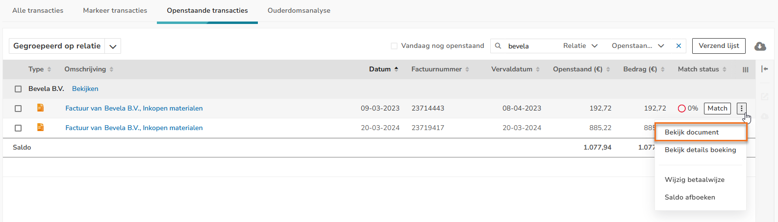 • Hover your mouse over the line of the relevant invoice, click on the button with the three dots, and then select the View document menu option in the dropdown menu.