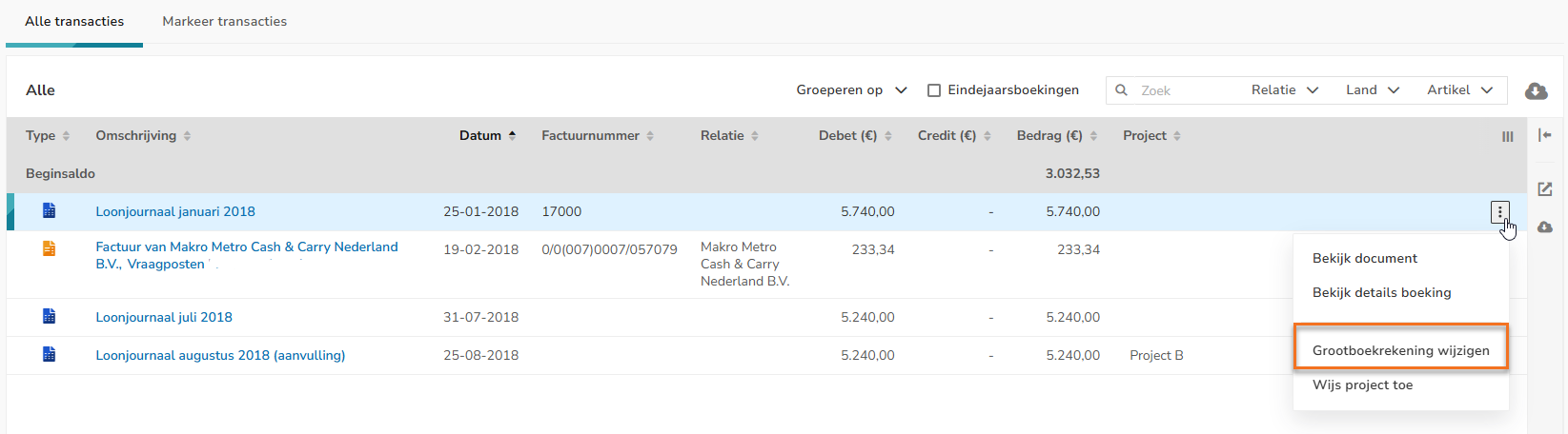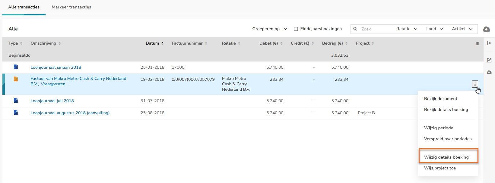 Then, for an invoice, select the Edit transaction details menu option from the dropdown menu.