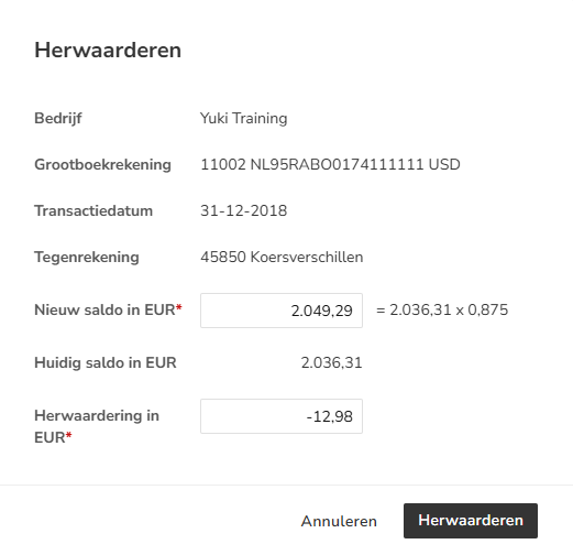 The end date of the financial year will be used as revaluation date. The balance in foreign currency will be converted to the known exchange rate on that date. When you click on the Confirm button a general journal entry will be created that corrects the original invoice amount (in standard currency) to the balance according to the known exchange rate at the given date.