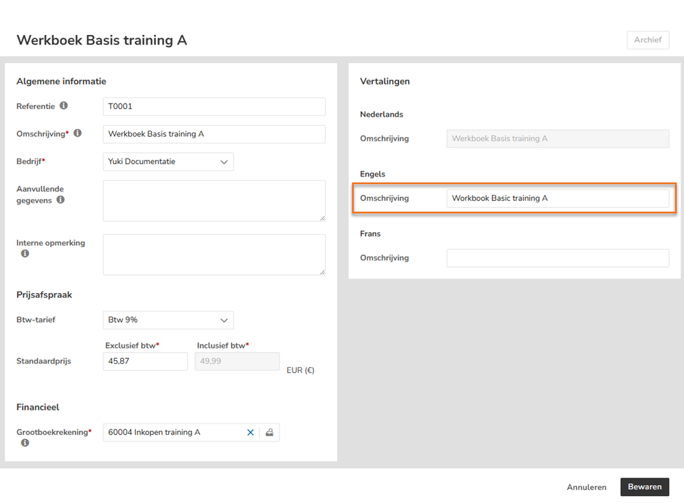 The translation of the description of the sales item can be entered in the ‘Description’ field under the relevant foreign language.