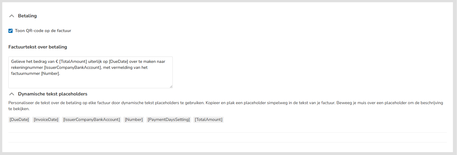 You can use so-called dynamic text placeholders in the invoice text about the payment. A placeholder is a special reference to invoice details that can be used in the invoice text. A placeholder is always enclosed in square brackets.