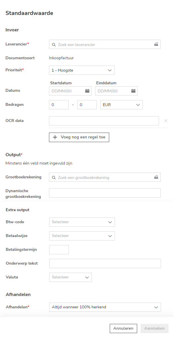 When setting a default value (processing rule), it is important to fill in the specific criteria and output fields that correspond to the purchase invoice for which you are setting the rule.