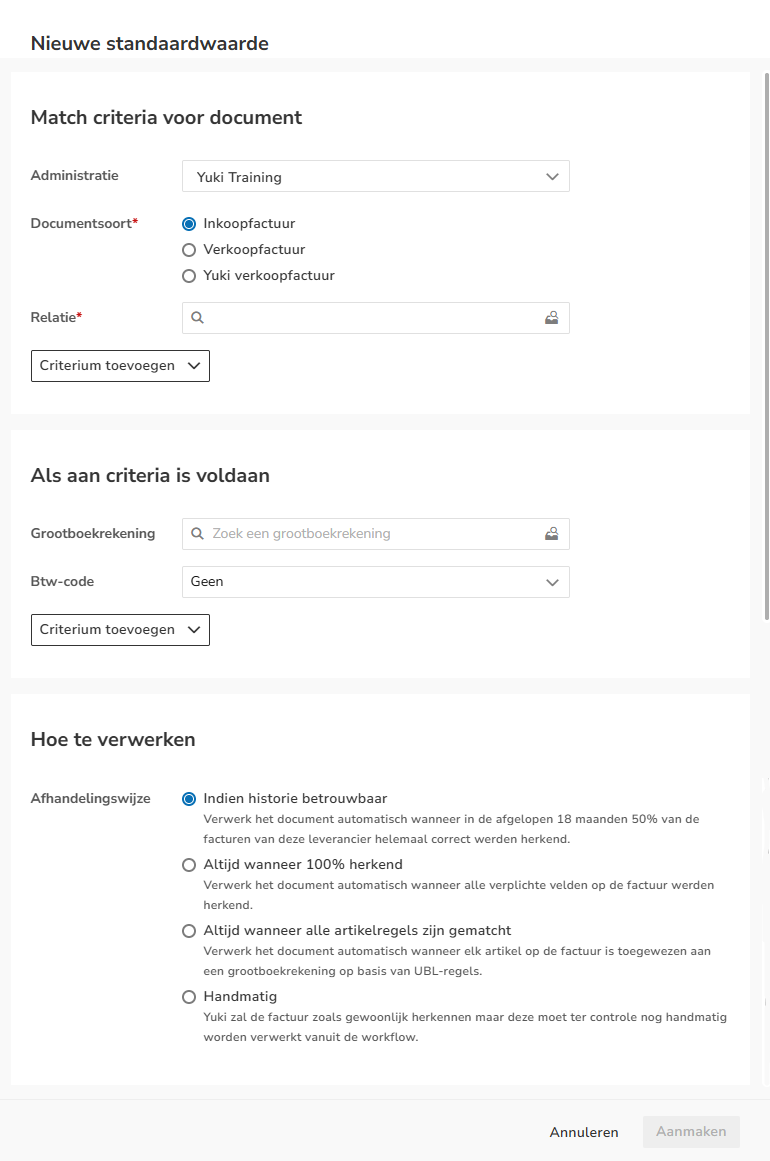 By default, the purchase invoice will only be processed if the history is sufficiently reliable. This means that at least 50% of the invoices from this supplier have been correctly recognized in the past 18 months.