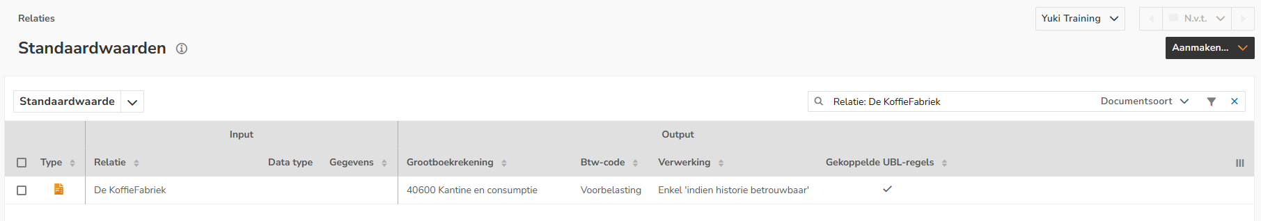 In the screenshot below, a default value has been created for a purchase invoice from the supplier De Koffiefabriek. All purchase invoices from this supplier will automatically be posted to the GL account 'Canteen and consumption costs' with the VAT code 'Input tax'.