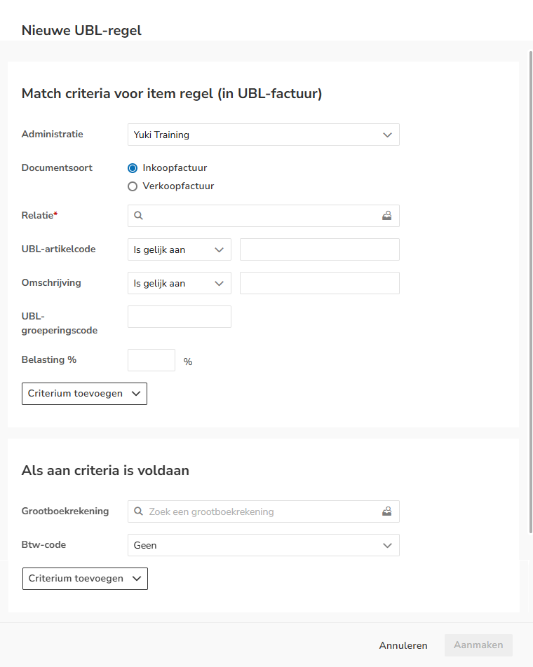 - Enter input criteria: Under 'Match criteria for item line (in UBL invoice)', enter the data the UBL rule must meet. These are the conditions the invoice must meet for the UBL rule to be applied.