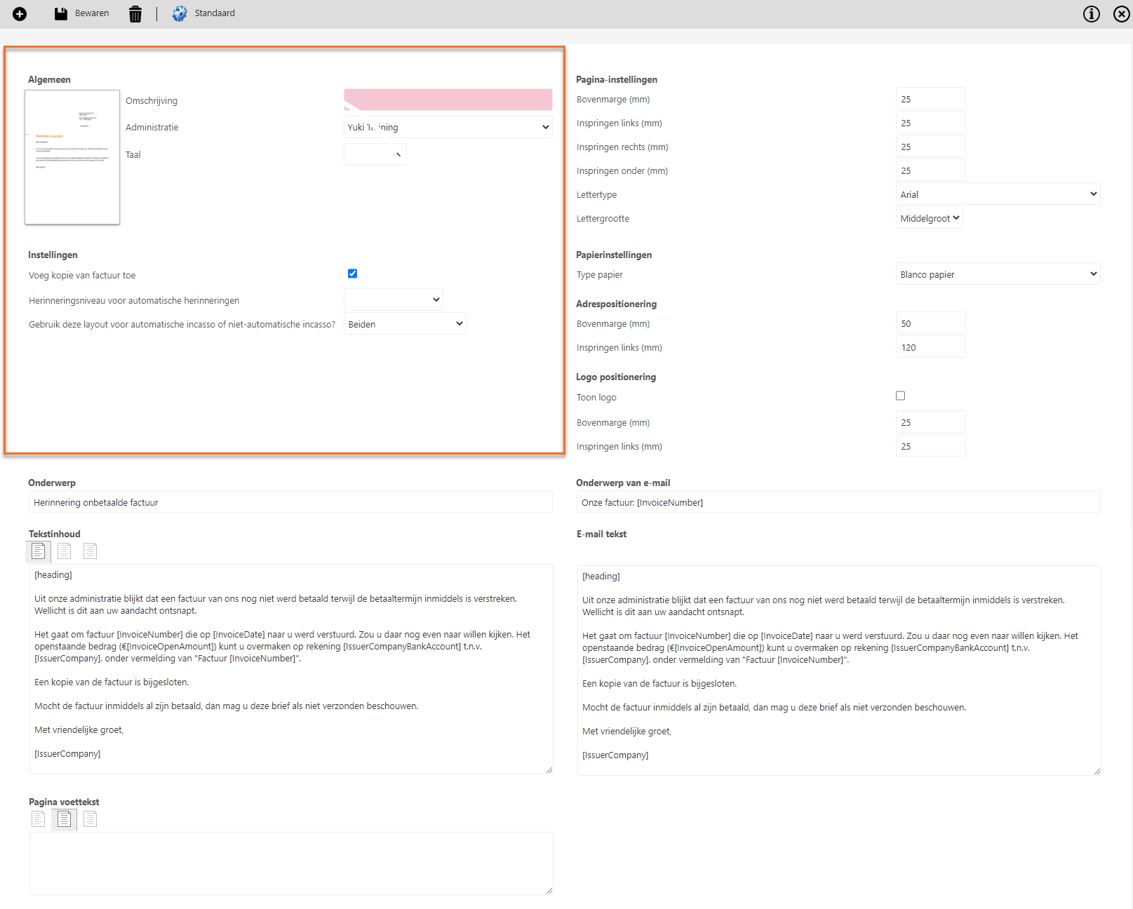 Geef je lay-out een herkenbare omschrijving mee. Wanneer je dit veld leeg laat vult Yuki automatisch de volgende omschrijving in: 'Automated reminder, level 1', of 'rappel automatique, niveau 1'.