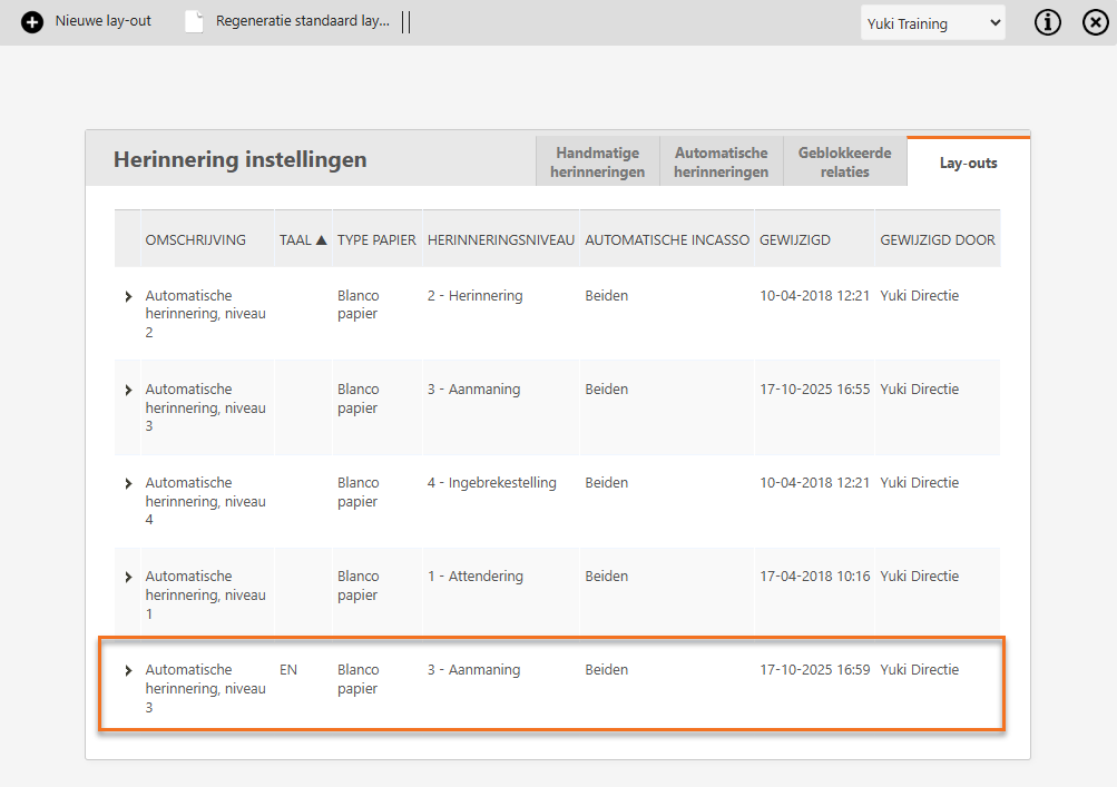 Wanneer je van één of meer herinneringsniveaus de standaard lay-out hebt verwijderd kun je deze altijd opnieuw genereren (in de taal die je als gebruiker hebt ingesteld bij 'Persoonlijke voorkeuren') door te klikken op de knop Regeneratie standaard lay-outs.