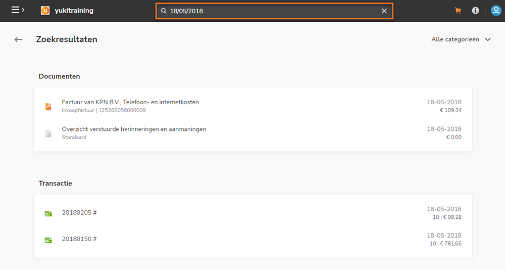 Yuki onthoudt de categorieën waarbinnen je wilt zoeken zodat je bij een volgend gebruik van de Zoekfunctie automatisch in dezelfde categorieën zoekt. Ook de zoekterm wordt door Yuki onthouden, bij een volgend gebruik van de Zoekfunctie kun je desgewenst direct een nieuwe zoekterm invoeren.