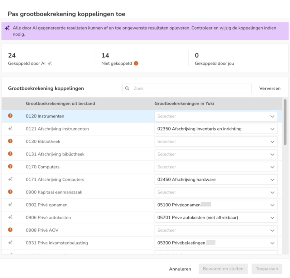 Bovenin dit scherm zie je het aantal grootboekrekeningen dat door AI is gekoppeld aan een corresponderende grootboekrekening in Yuki.