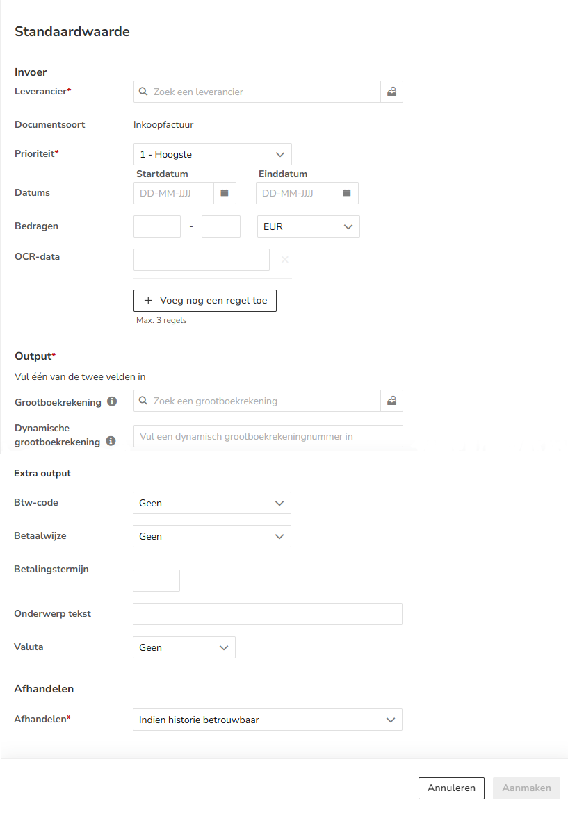Bij het instellen van een standaardwaarde (verwerkingsregel) is het belangrijk om de specifieke criteria en outputvelden in te vullen die overeenkomen met de inkoopfactuur waarvoor je de regel instelt.