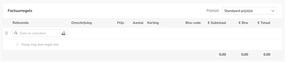 - selecteer het artikel dat je wilt toevoegen op de factuur. Alleen de artikelen van de hierboven geselecteerde prijslijst worden getoond.