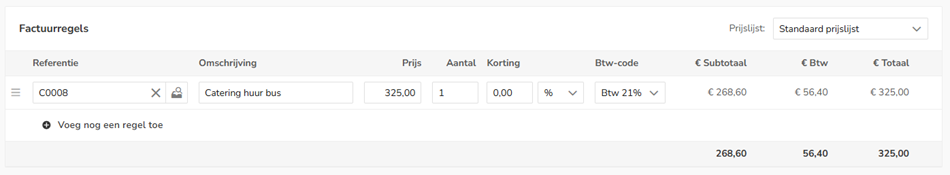 De gegevens van het artikel zoals de omschrijving worden automatisch ingevuld op de factuurregel. - wijzig desgewenst het aantal, de prijs, de korting (bedrag of percentage) en/of de btw-code van het artikel.