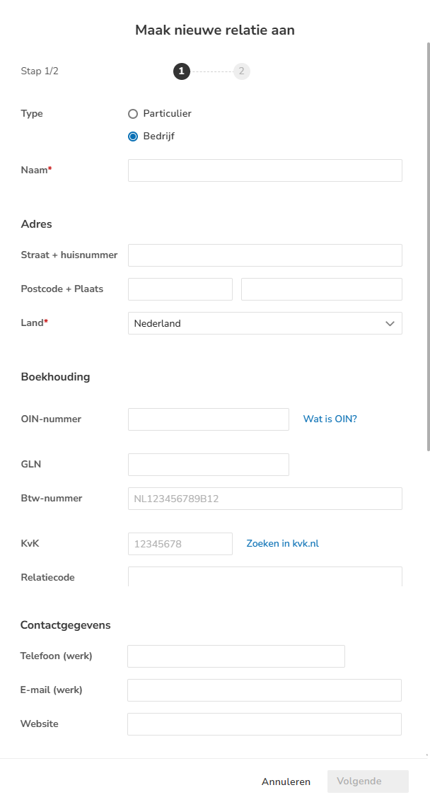 - OIN-nummer (alleen beschikbaar wanneer bij het adres het land 'Nederland' is geselecteerd)