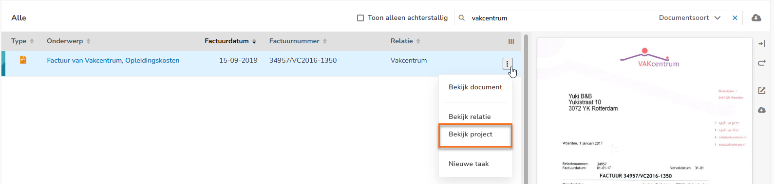 Om het project te bekijken waaraan de factuur is gekoppeld: