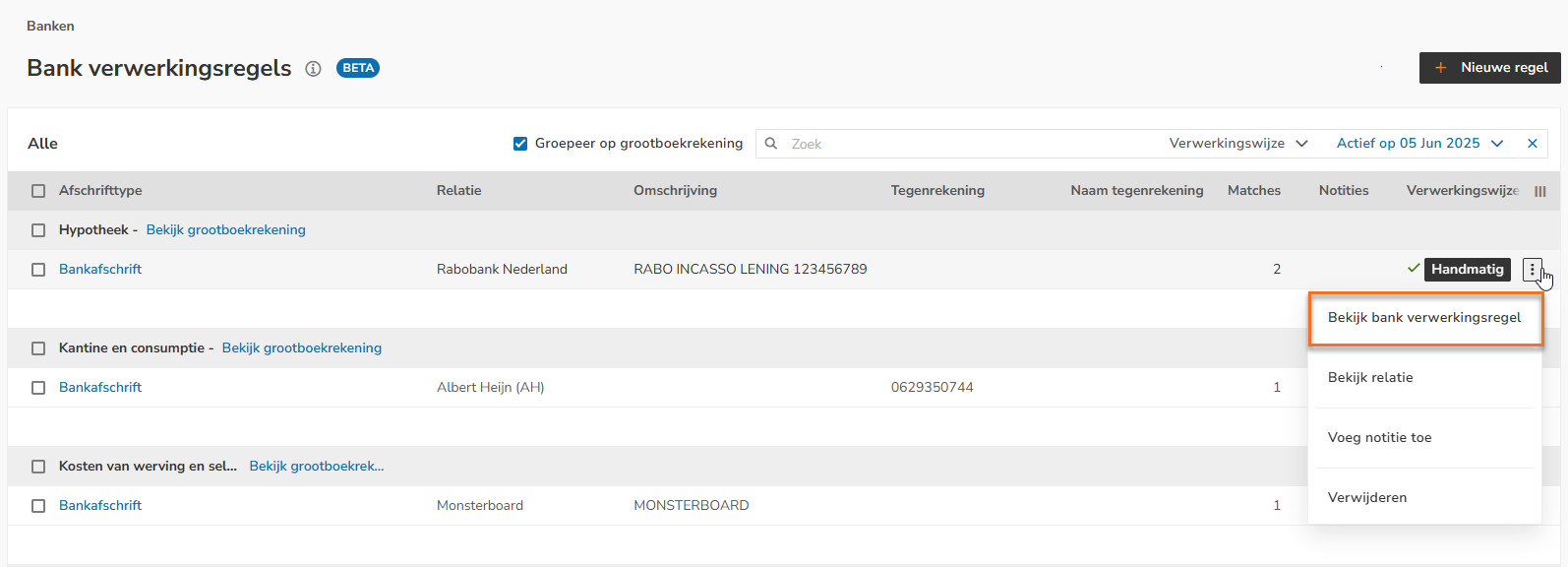 Beweeg met je muis boven de regel van de desbetreffende bank verwerkingsegel, klik op de knop met de drie puntjes en selecteer vervolgens Bekijk bank verwerkingsregel in het dropdownmenu.