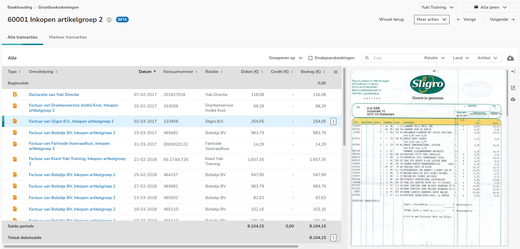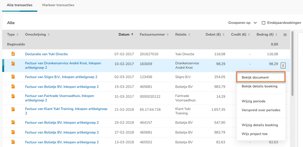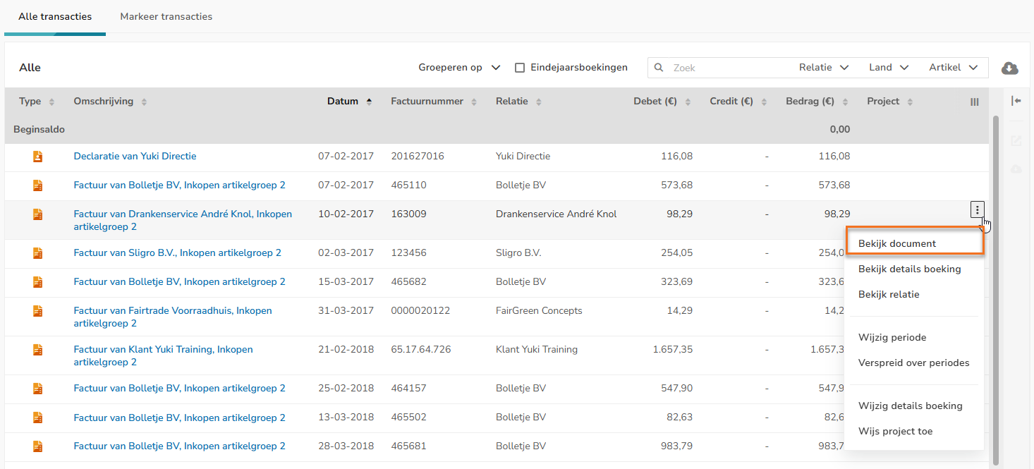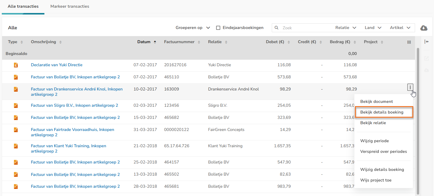 Om de details van de boeking te bekijken, beweeg je mer de muis boven de regel van het desbetreffende document en klik je op de knop met de drie puntjes. Selecteer vervolgens de menuoptie Bekijk details boeking in het dropdowmenu.