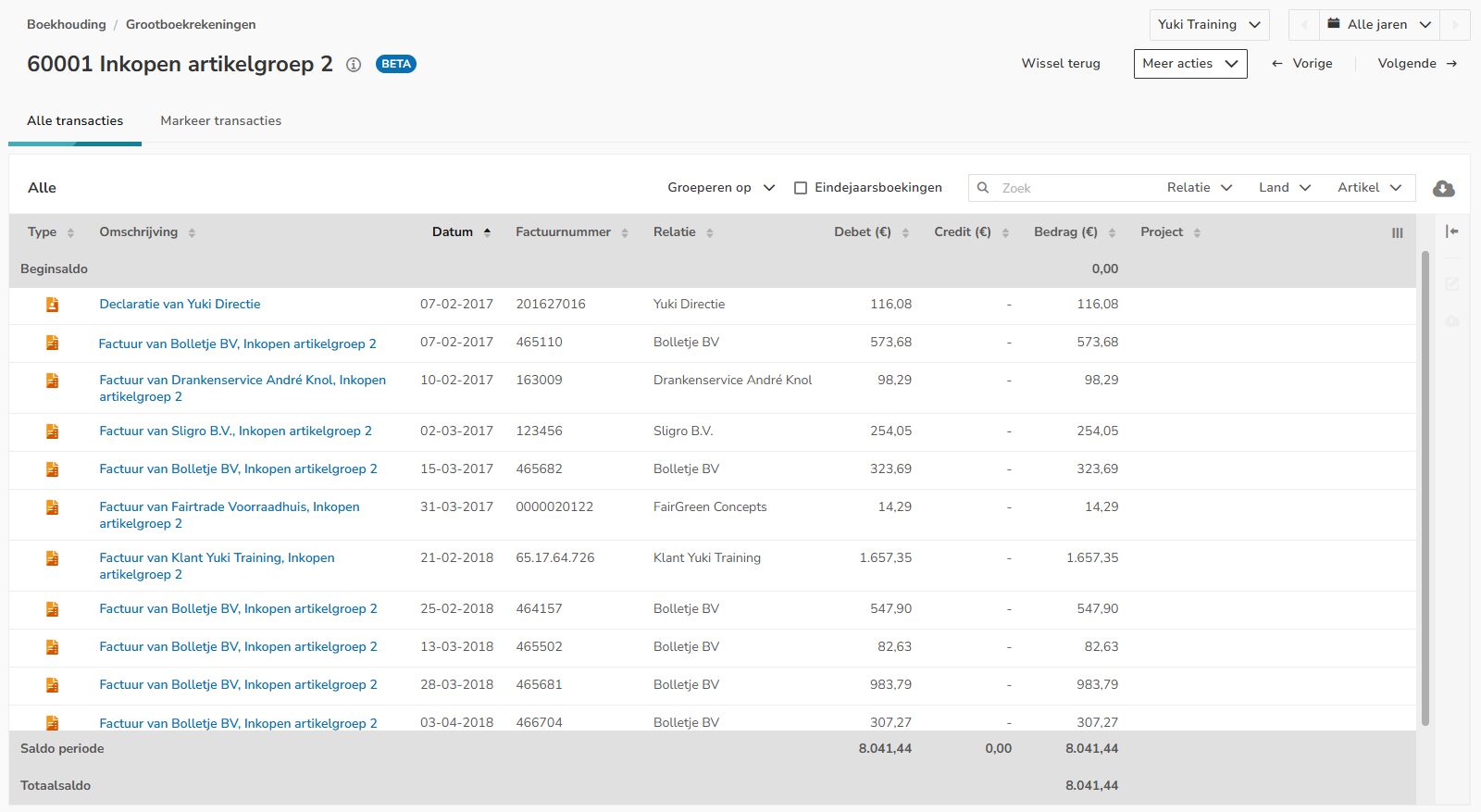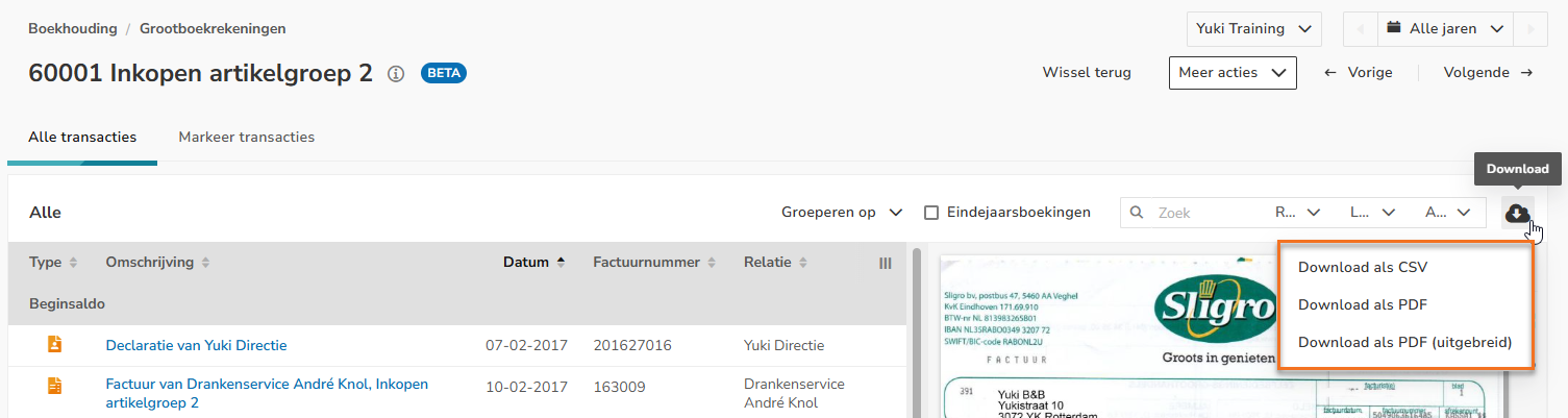 Je kunt in de functionaliteit Boekhouding de transacties op één of meer grootboekrekeningen exporteren naar bijv. een Excel bestand door te klikken op 'Exporteren'.