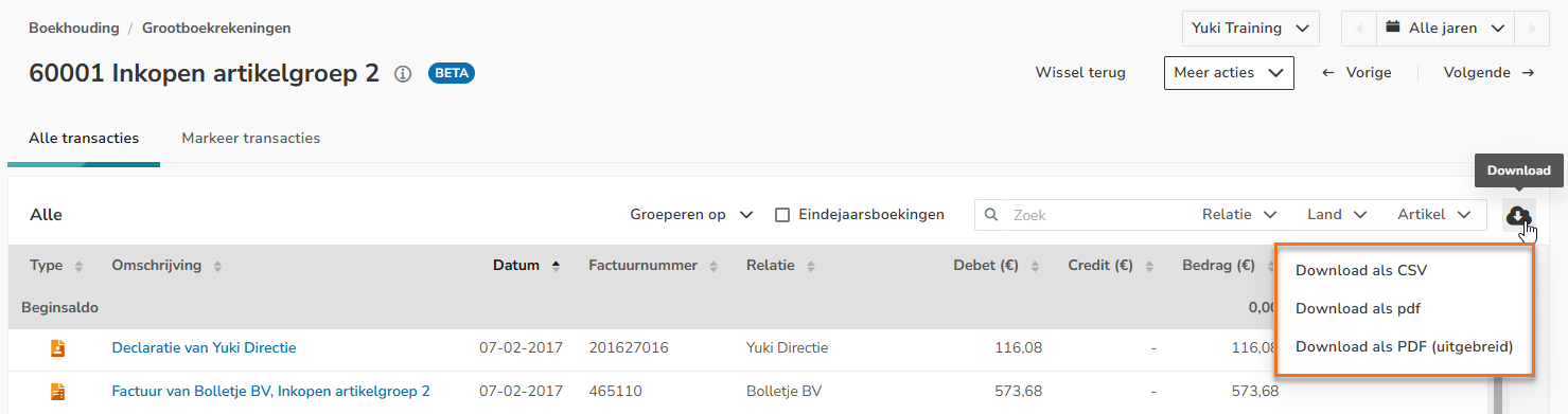 Klik op de knop Download (icoon Wolkje met pijltje naar beneden) en selecteer vervolgens de menuoptie Download als CSV, Download als PDF of Download als PDF (uitgebreid) in het dropdownmenu.