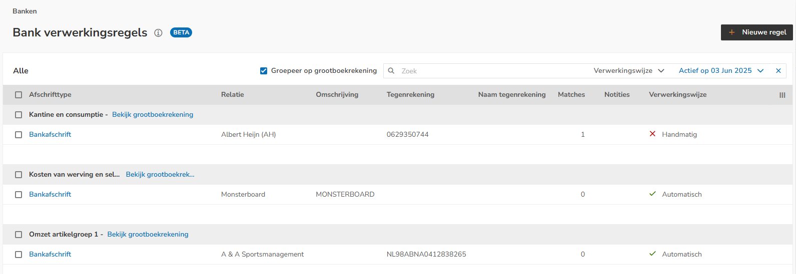 Voor een uitgebreide beschrijving over het instellen van een bank verwerkingsregel zie artikel Bank verwerkingsregel aanmaken.