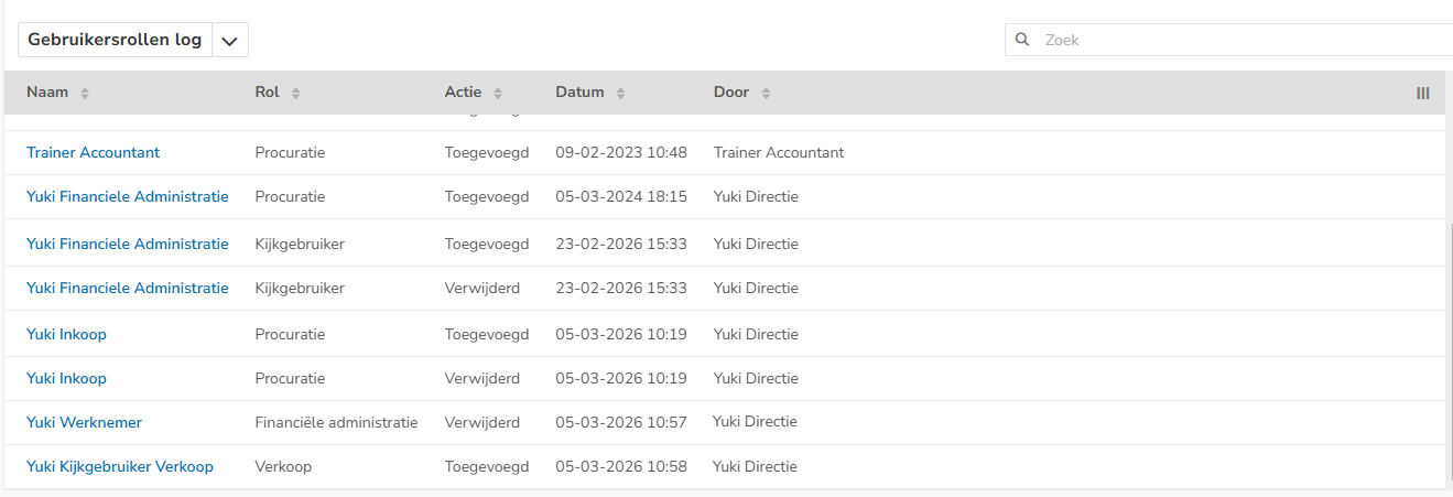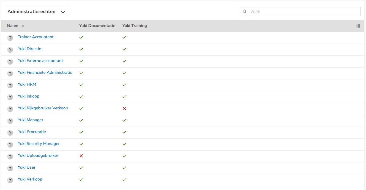 Voor elke gebruiker in een domein kan worden bepaald tot welke administratie(s) hij of zij toegang heeft. Rollen worden in Yuki gebruikt om rechten te regelen. Elke gebruiker heeft bepaalde basisrechten. Door iemand een rol toe te kennen, kun je iemand extra rechten geven.