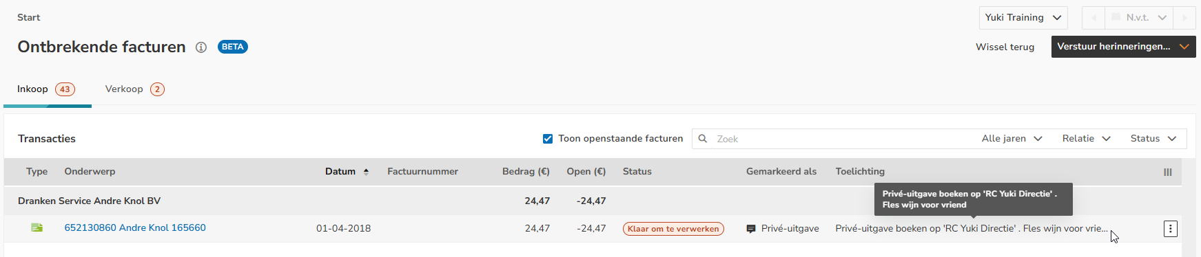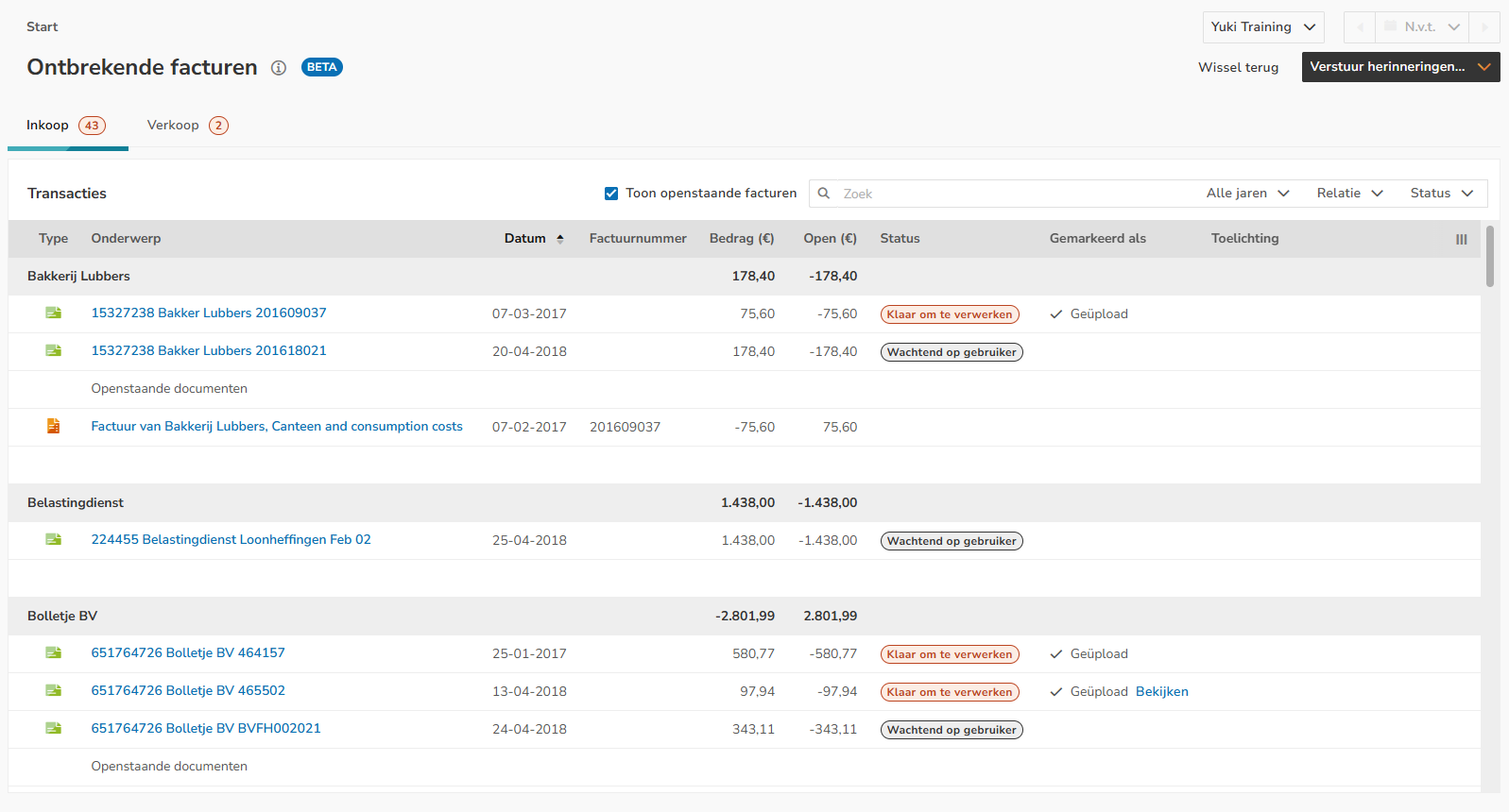 Raadpleeg dit overzicht regelmatig, verwerk de betalingen en stuur indien nodig herinneringen naar de ondernemer over de ontbrekende inkoop- of verkoopfacturen.