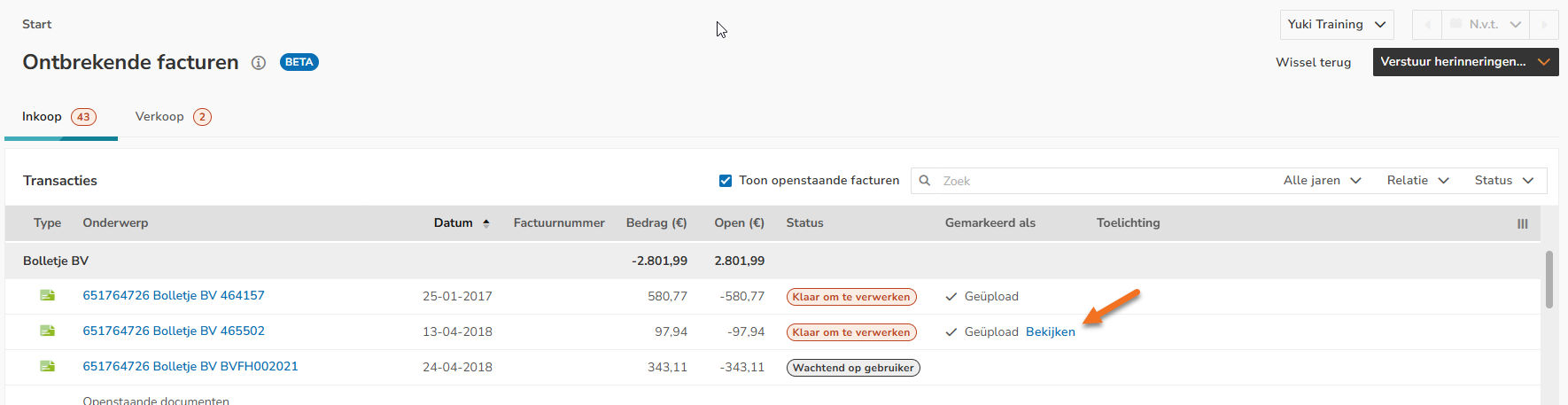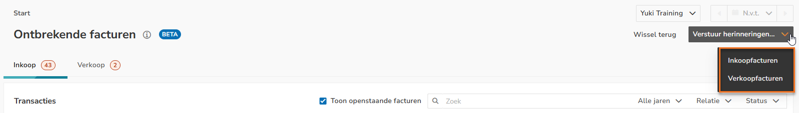 Weergaven overzicht Ontbrekende facturen
