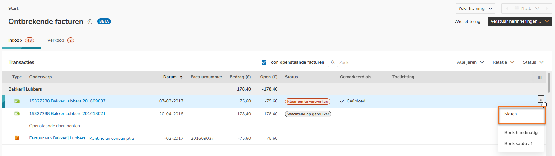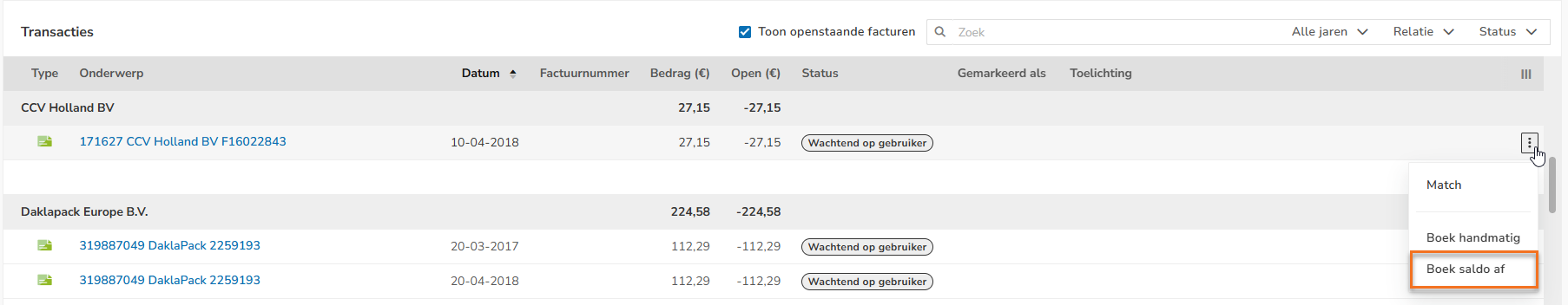 In het nu geopende scherm kan de openstaande transactie, indien mogelijk, worden gematcht waardoor deze uit het overzicht 'Transacties' verdwijnt.