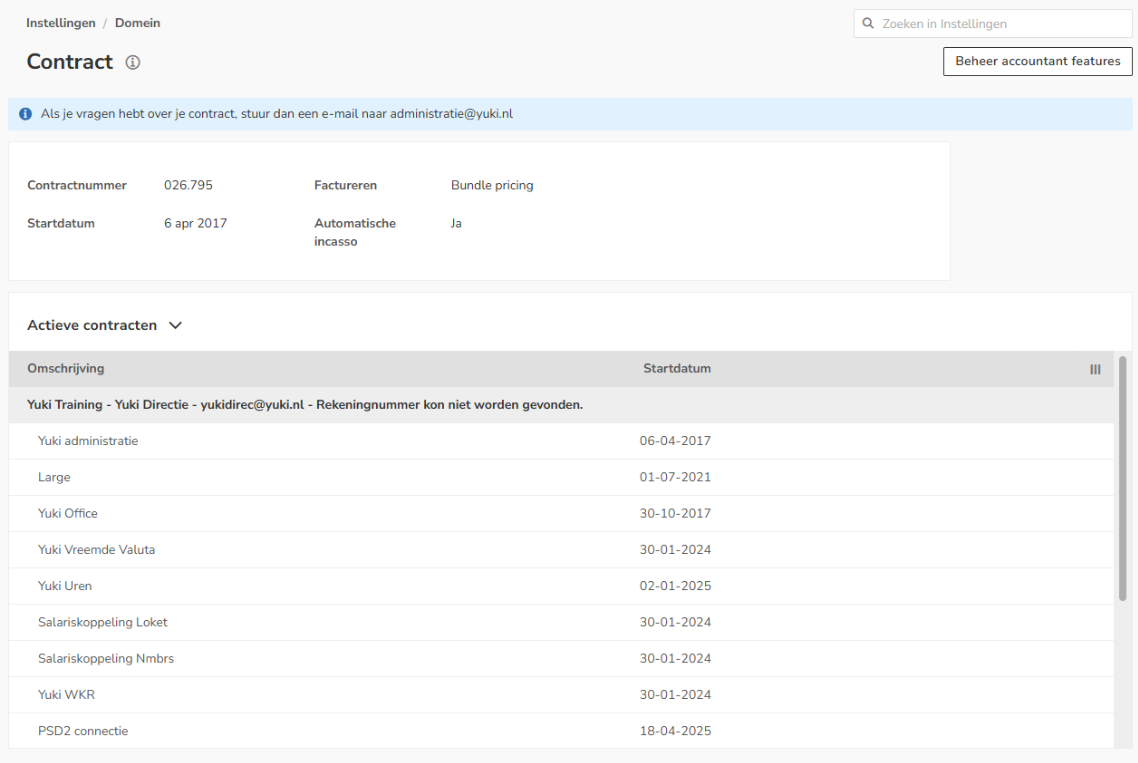 Vanuit een domein kun je de gegevens van je contract met Yuki bekijken.