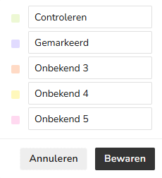 De standaard markeer instellingen zijn de instellingen voor de categorieën die je kunt gebruiken om transacties op grootboekrekeningen te markeren. Je kunt per kleur een standaard categorienaam instellen. Onderaan het scherm zie je het totaal van alle transacties die vallen onder een specifieke categorie.