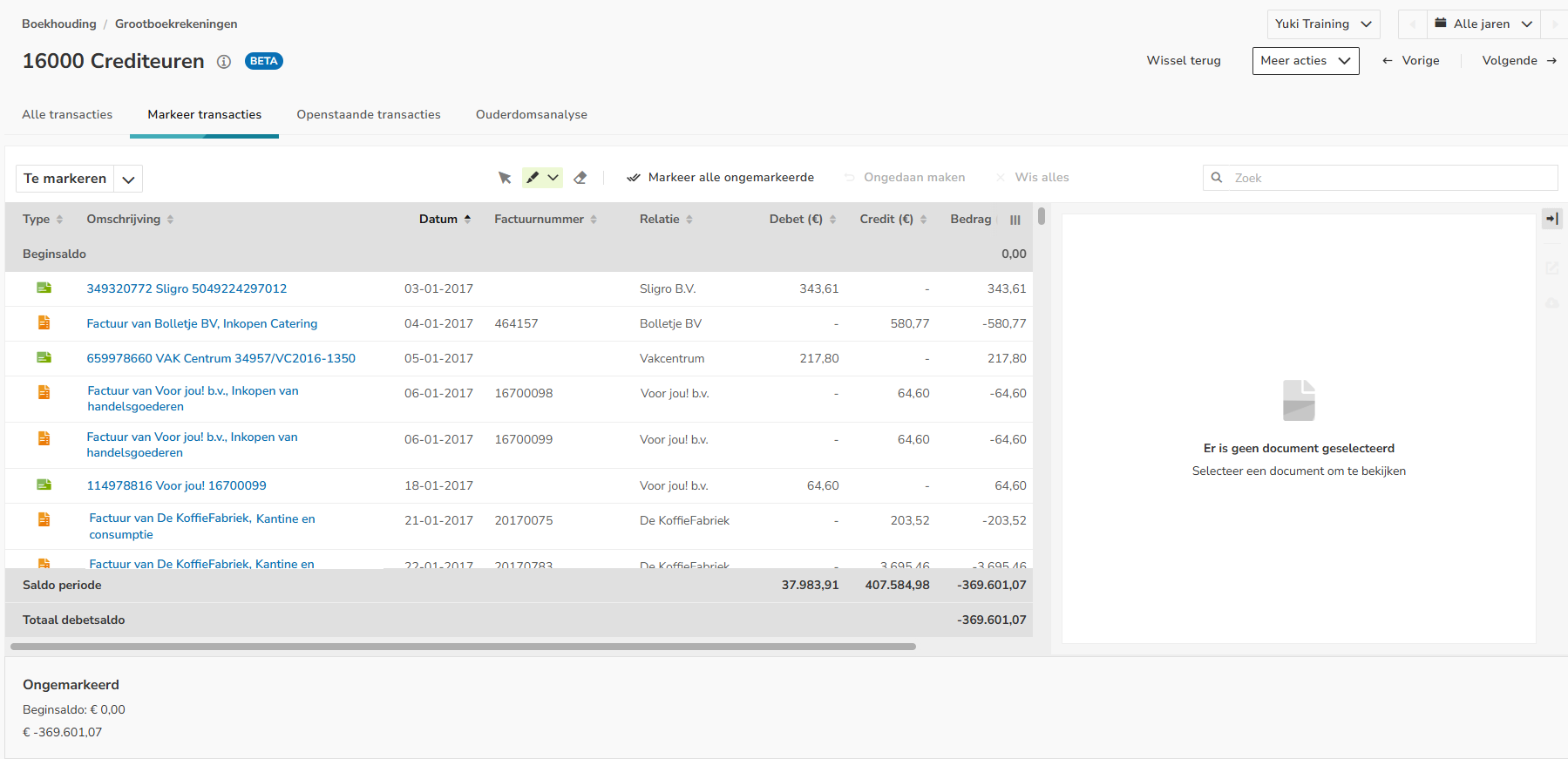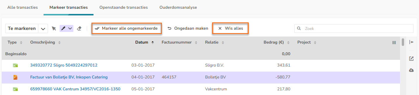 Hier worden alle ongemarkeerde en gemarkeerde transacties getoond