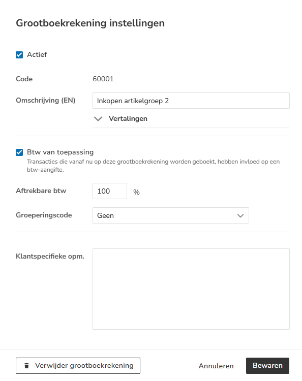 Klik op het pijltje voor Vertalingen om de omschrijving te vertalen naar het Engels of het Frans. - Btw van toepassing: is er btw van toepassing (moeten boekingen op deze rekening meegenomen worden in de btw-aangifte?)