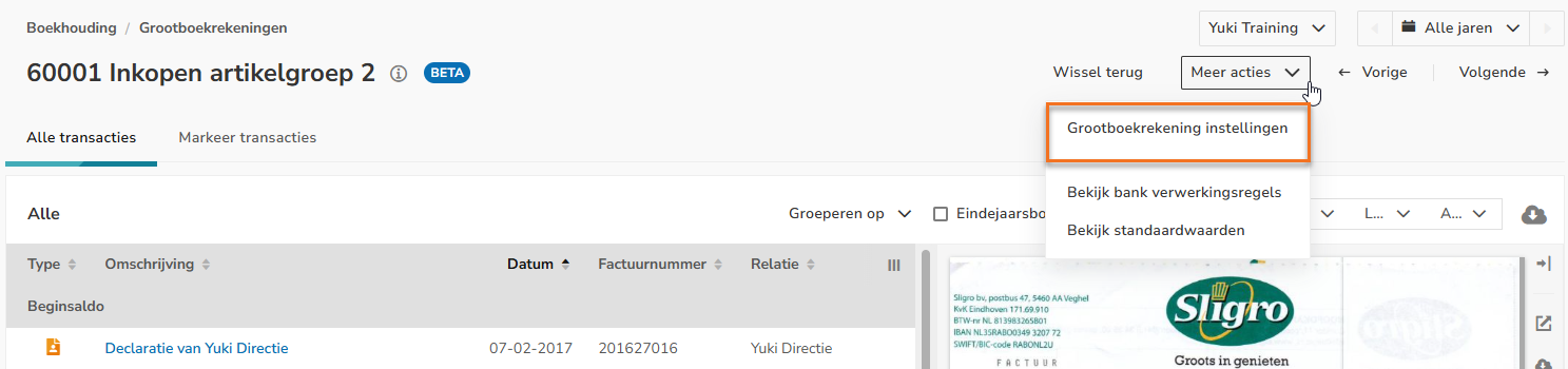 Om de instellingen van een grootboekrekening te wijzigen, open je de desbetreffende grootboekrekening, Klik vervolgens in het nu geopende scherm op de knop Meer acties en selecteer vervolgens Grootboekrekening instellingen in het dropdownmenu.