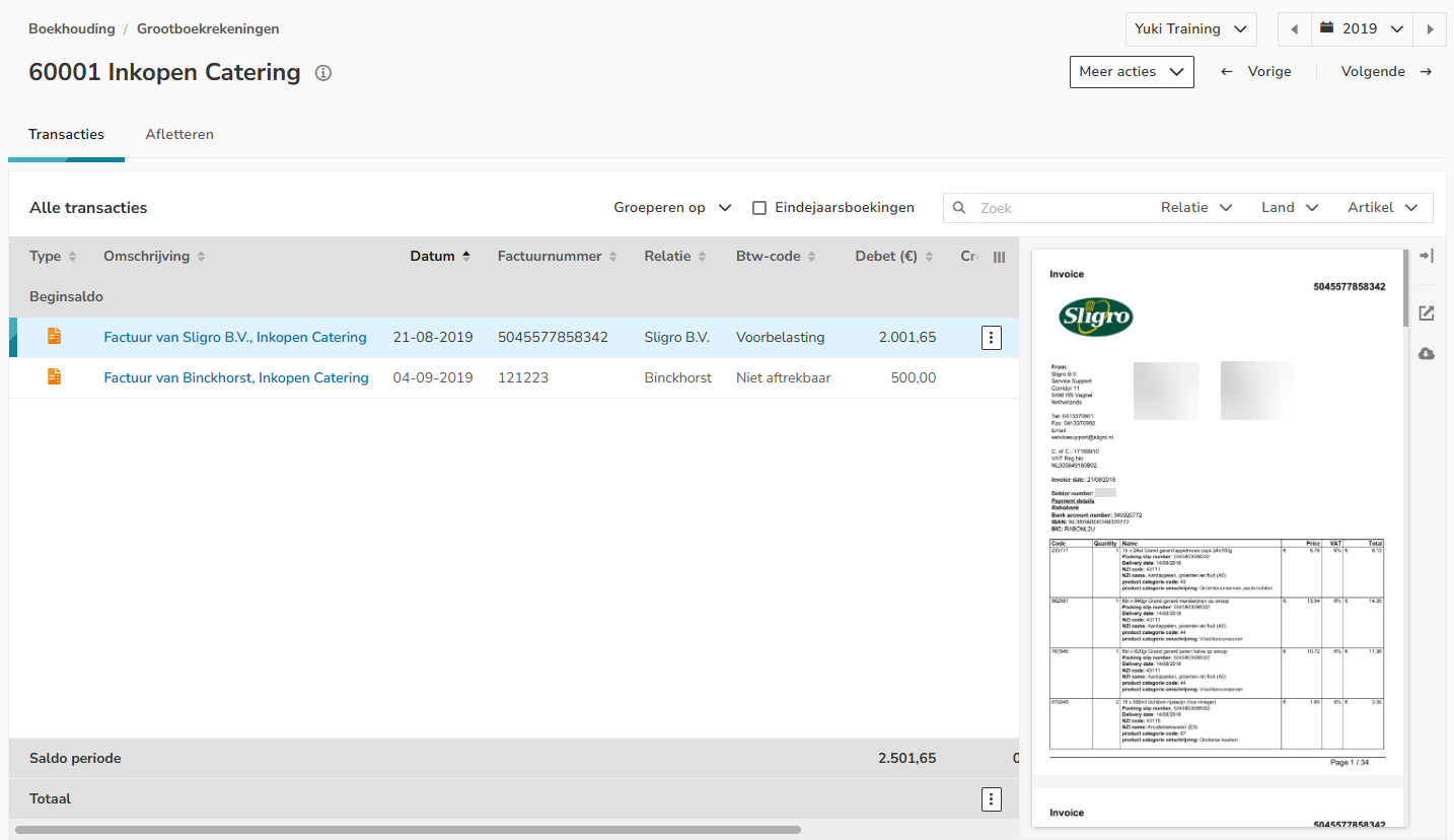 De transacties van in- en verkoopfacturen kunnen in Yuki vanuit een geopende grootboekrekening aan een project worden gekoppeld.
