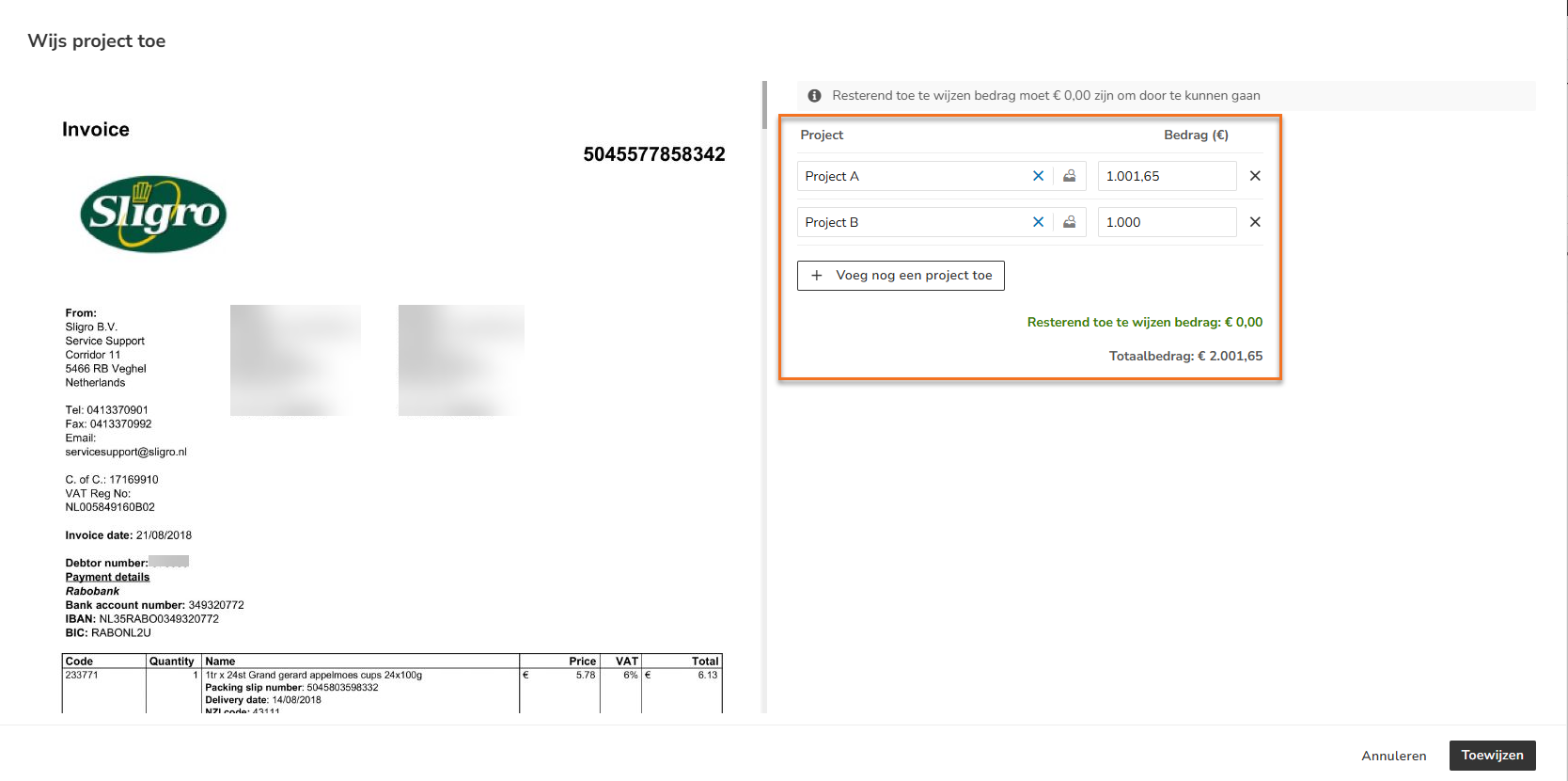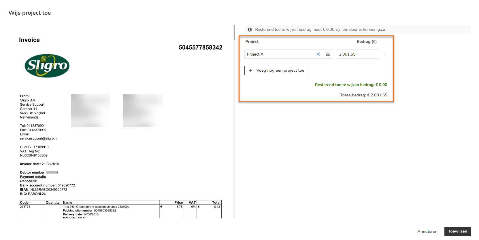 Indien je de transacties van een in- of verkoopfactuur aan twee of meer projecten wilt toewijzen klik je op de knop Voeg nog een project toe. Er wordt een tweede regel getoond waar je het restbedrag kunt toewijzen aan een ander project. Op die manier kun je een transactieregel opsplitsen en aan verschillende projecten koppelen.