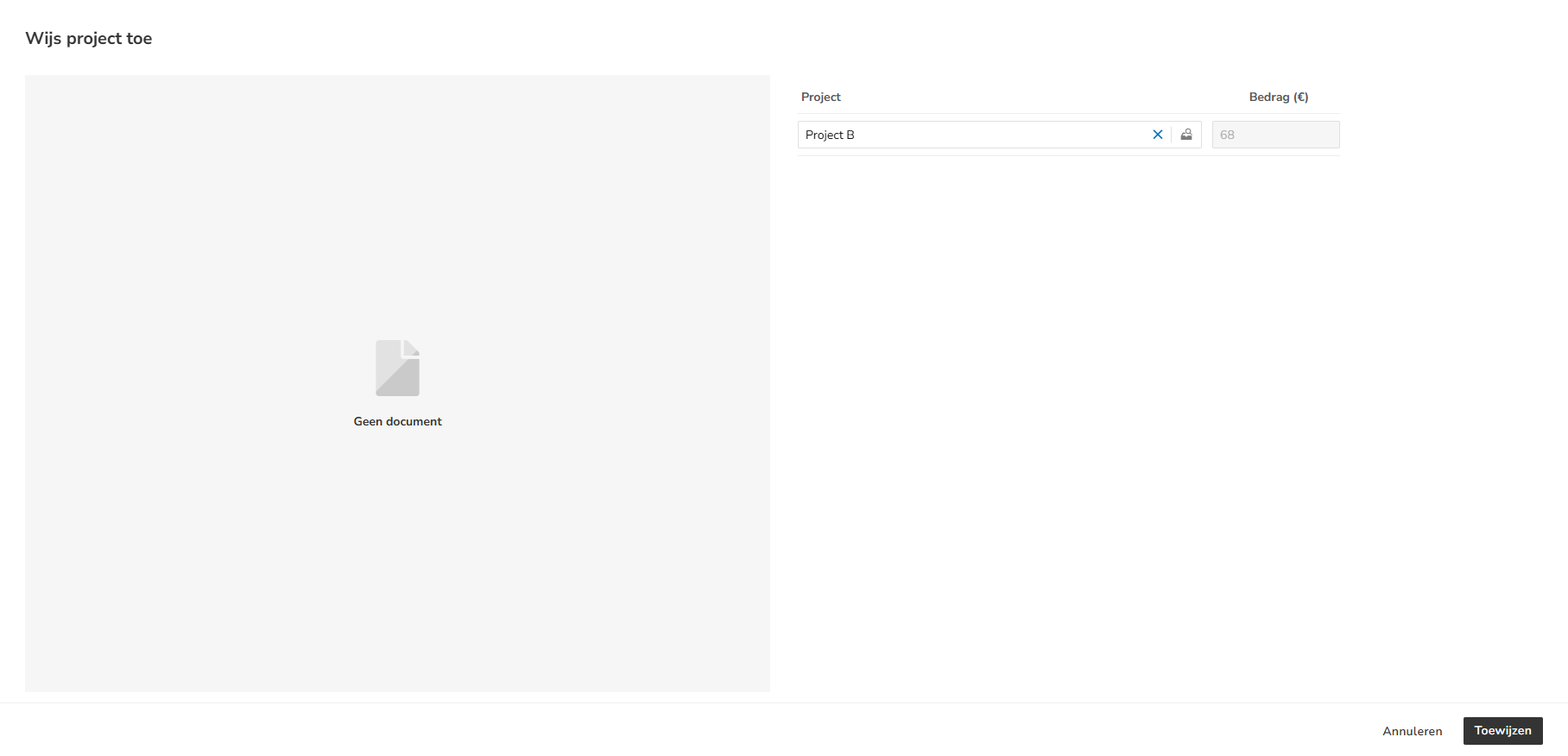 - Na het klikken op de knop Toewijzen wordt de banktransactie aan het (andere) project gekoppeld.