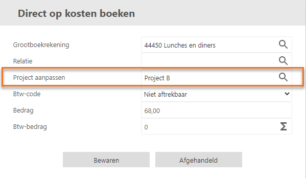 Na het klikken op de knop Bewaren of Afgehandeld wordt de banktransactie aan het project gekoppeld.