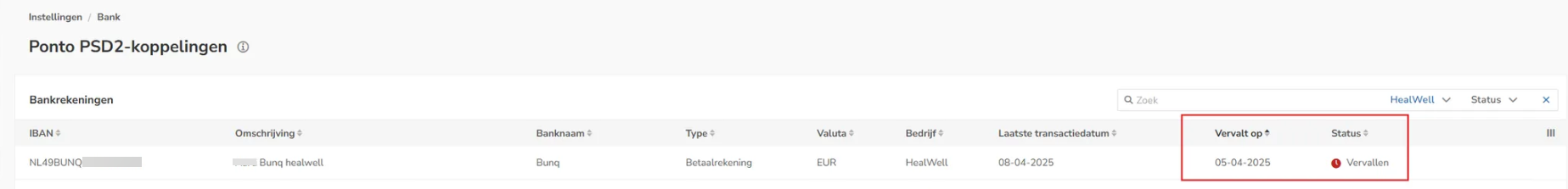 Elke 6 maanden moet de autorisatie van een gekoppelde bankrekening in Ponto worden vernieuwd. De vervaldatum van de autorisatie staat in het overzicht van de PSD2-koppelingen in de kolom Vervalt op.