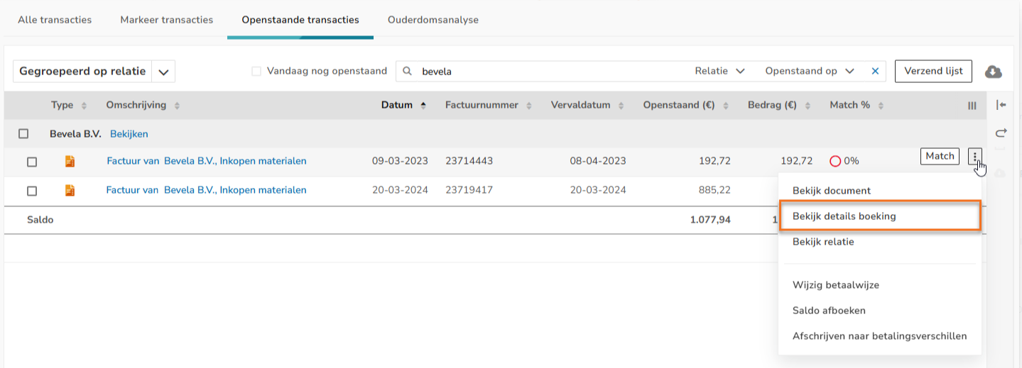 - selecteer je vervolgens de menuoptie Bekijk details boeking in het dropdownmenu.