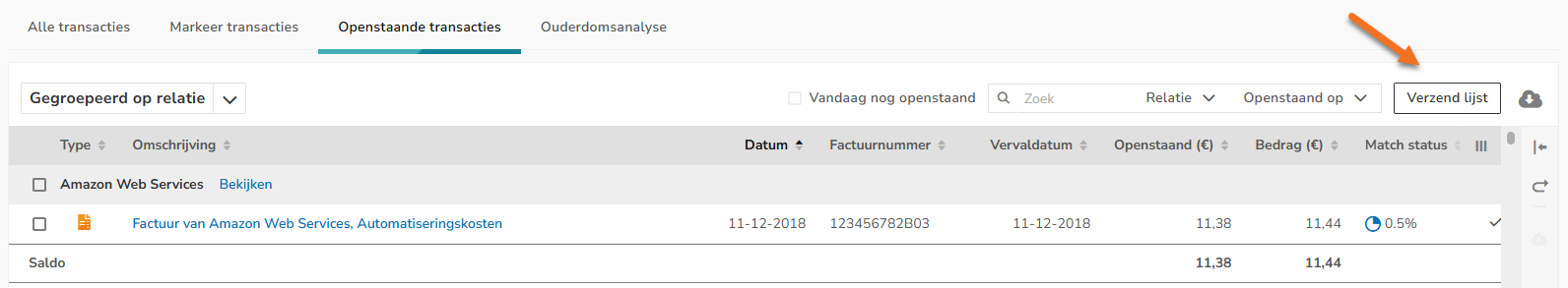 Om een lijst met openstaande posten naar de gebruiker te sturen, klik je op de knop Verzend lijst.